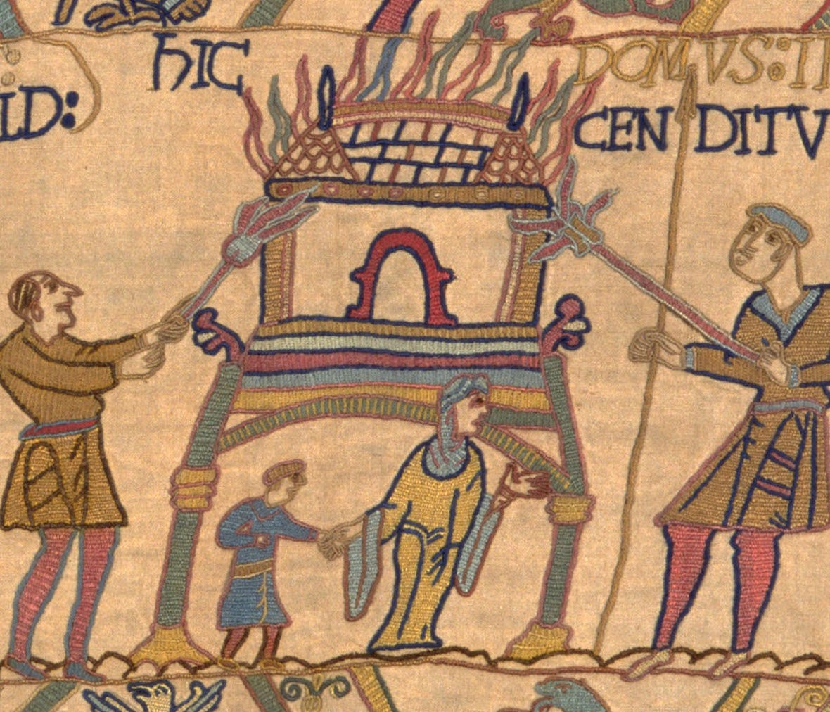 Of the 626 individuals depicted on the tapestry, the main narrative boasts just three women. Of the fifteen named individuals, only one is a woman—and a woman lost to history, at that. One woman is fleeing a burning building pulling a young child along with her while another is being encroached upon by a man and an unwanted touch. Patriarchy and the harm it perpetuates so perfectly depicted: nameless men’s bodies scattered across the entire swath; men finding meaning in the defiling and destruction of others; hierarchical social structures propagandized as a means of ‘law & order’ and divine right; a particular attention to phallus sizes; and most importantly, women almost entirely missing from the narrative while those present are totally eclipsed by male dominance.