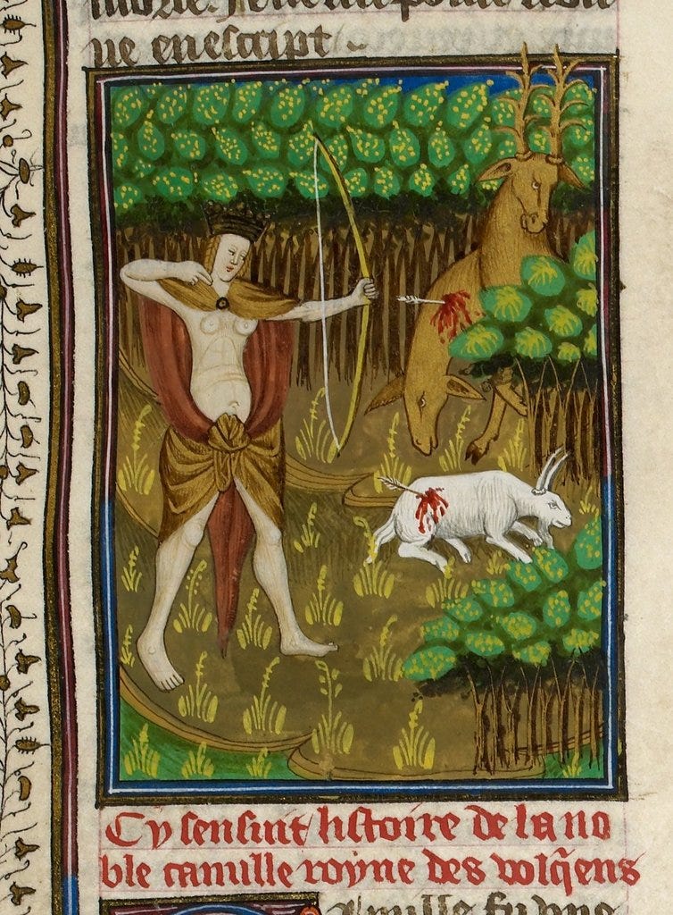 Around 1143 Peter abbot of Cluny wrote to the ‘venerable and greatly beloved’ Heloise, “it is not altogether exceptional among mortals for women to be in command of men, nor entirely unprecedented for them even to take up arms and accompany men to battle.”1 Within the pages of Orderic Vitalis’ eleventh and twelfth century chronicle Historia Ecclesiastica, Isabel de Conches is preserved as having faced war “armed as a knight…and she showed no less courage among the knights in hauberks than did the maid Camilla.”2 Likewise, William of Newburgh’s Historia rerum Anglicarum documents a countess of Leicester, Petronella, as ‘a woman with a man’s spirit.’ While Fantosme’s Chronicle informs us the same Petronella counseled her husband and was captured alongside him donning armor.3